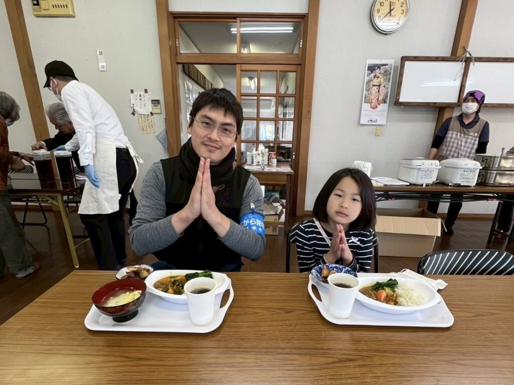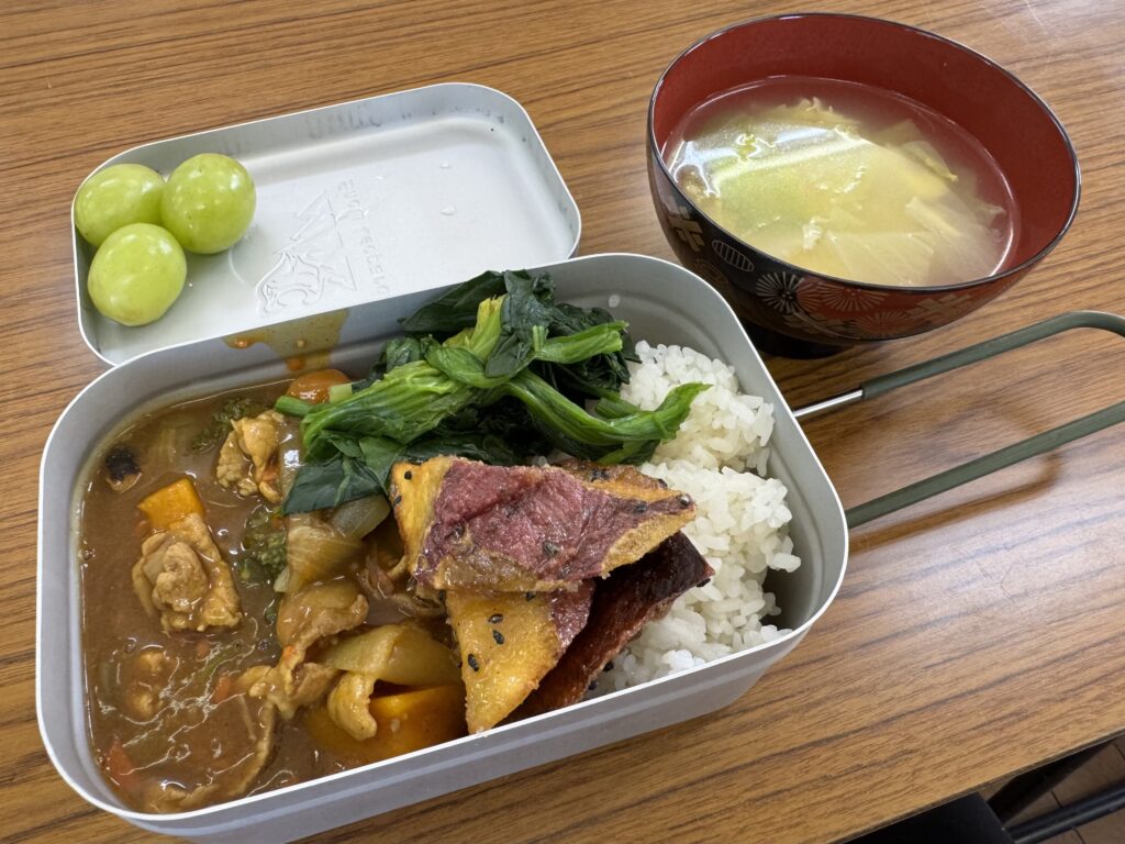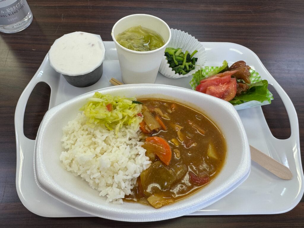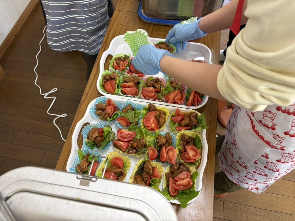 今回のメインメニューは、地域の皆様からご寄附いただいた新鮮な野菜をふんだんに使用した「愛かずトマトカレー」です。皆さんから「とっても美味しいです!」「頑張ってね!」といった、大変うれしい感想をいただきました。