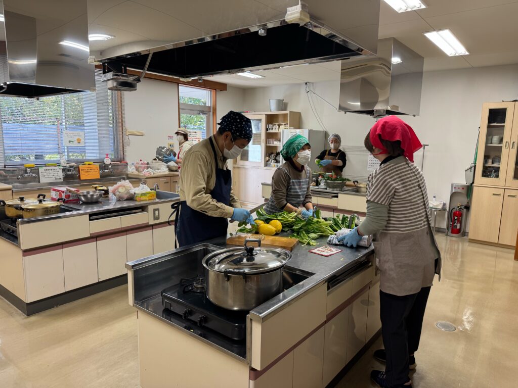 スタッフは、事前の体調確認や衛生管理を徹底。周西公民館の調理室でカレー30食のほか、寄附いただいた野菜を使ってサイドメニューなども調理しました。本番会場である神門自治会館を利用させていただき、自治会長をはじめ、お集まりいただいた地域の皆さんに出来立ての料理を提供。召し上がった皆さんからは「おいしい!」との声をたくさんいただき、会場は終始笑顔で溢れていました。提供後には、スタッフ間で振り返りと反省会を実施し、より良い運営に向けた課題を共有しました。